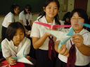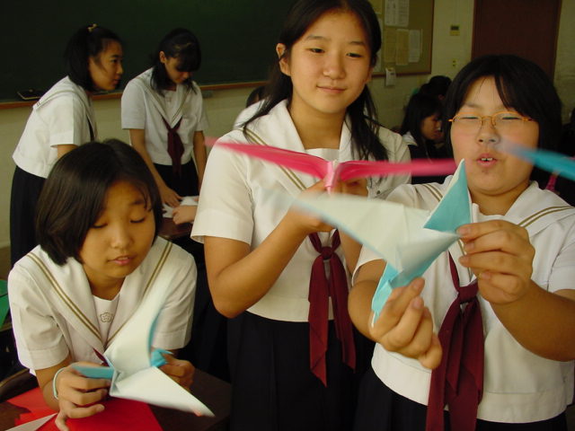 | 梅光女学院中学校2年b組で いっしょに折紙を折りました。 ニュージーランドの セールスマン作家の作品 「はばたくかもめ」です。 ダイナミックな羽ばたきが 魅力的な作品です。 |